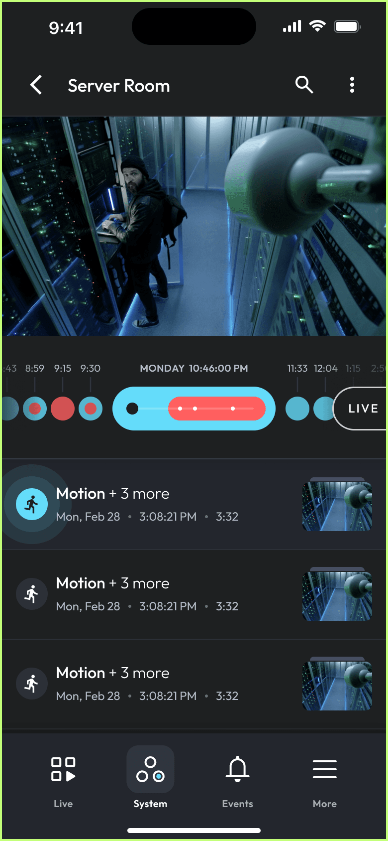 The same insight extended to the timeline scrubber. Our first redesign used a bubble-based approach — visual, modular, meant to feel fresh. It failed testing immediately. Operators couldn't parse the bubbles under pressure and their scanning rhythm broke. We scrapped it, looked at how Ring handles event-based timelines, and rebuilt around a linear scrubber with color-coded events and a "Jump to" feature for direct timestamp navigation. No learning curve. Operators adopted it immediately.
