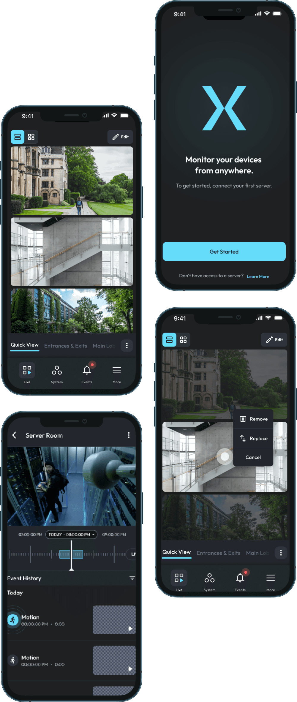 ExacqVision is enterprise security software used by operators who monitor live and recorded video footage across facilities — hospitals, warehouses, campuses. The mobile app was their companion away from the desk. The brief was straightforward: the app felt outdated, redesign it.