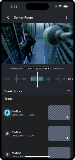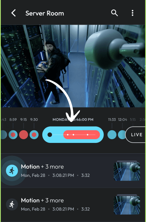 Linear scrubber. Color-coded events. Jump to timestamp.
