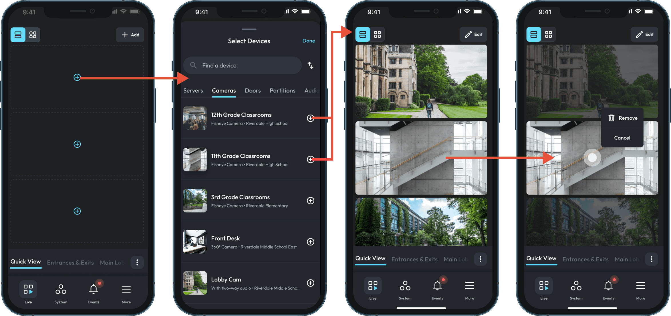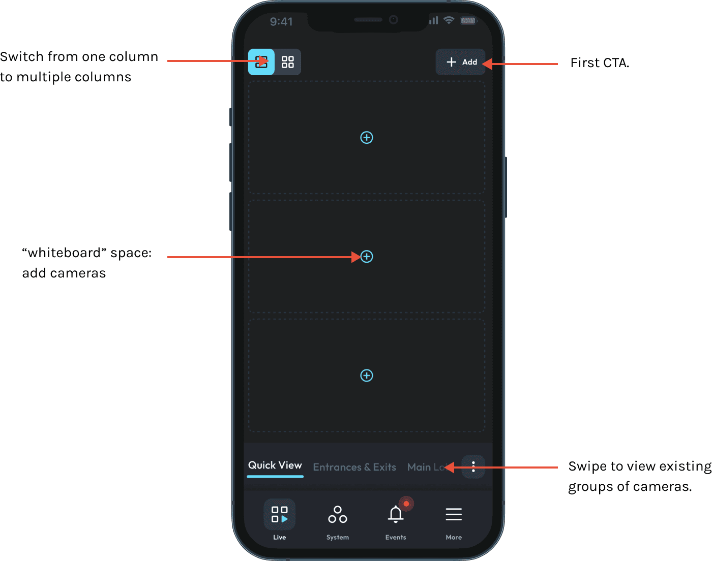 Instead of forcing operators to choose a predefined view, I introduced QuickView — an ad hoc mode that opens with an empty grid and a full list of available cameras. Operators pull in what they need, build a live situational workspace in seconds, and discard it when the moment passes. Nothing is saved unless they choose to save it.