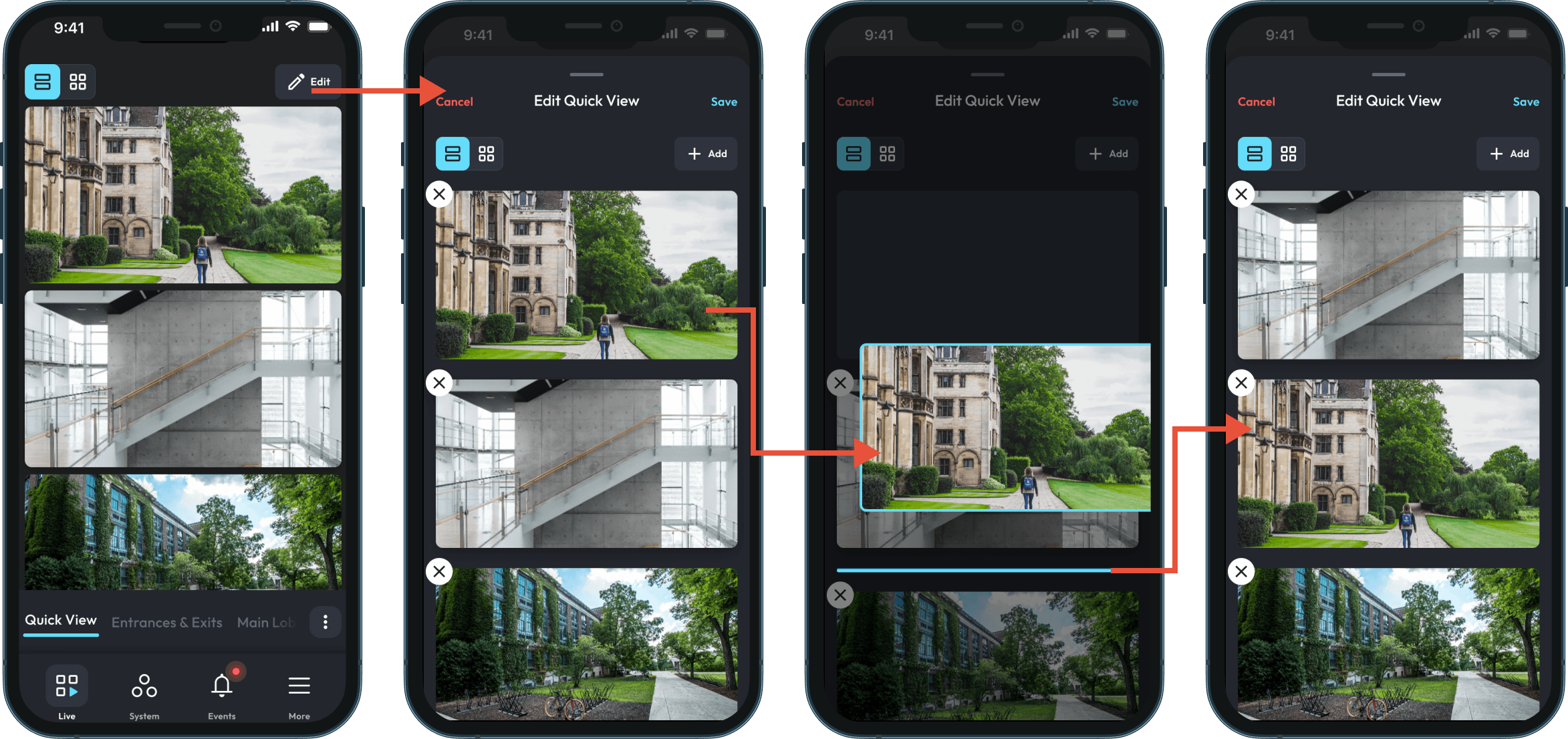 When within a Quickview, the user could edit the view freely, adding and removing cameras, as well as reordering them.